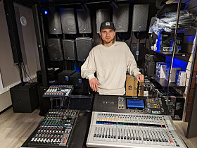 Elias Vinje med Yamaha TF3-mikseren som er koplet til ulike PA-system. Foto: Stian Sønsteng