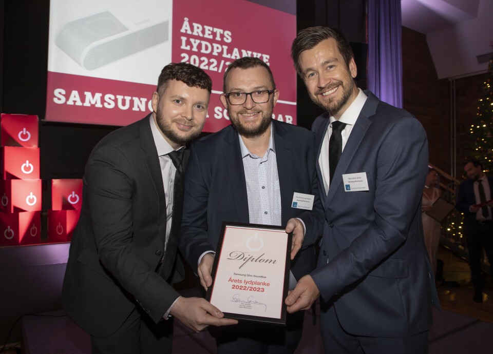 Kai Joar Kristensen (f. v.), Knut-Eirik Bruvold-Rørnes og Tor Helge Kasin i Samsung tok mot prisen for «Årets lydplanke 2022/2023». Foto: Tore Skaar