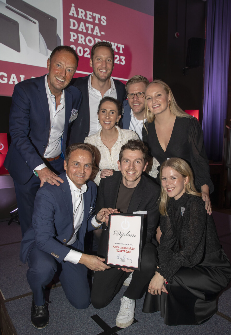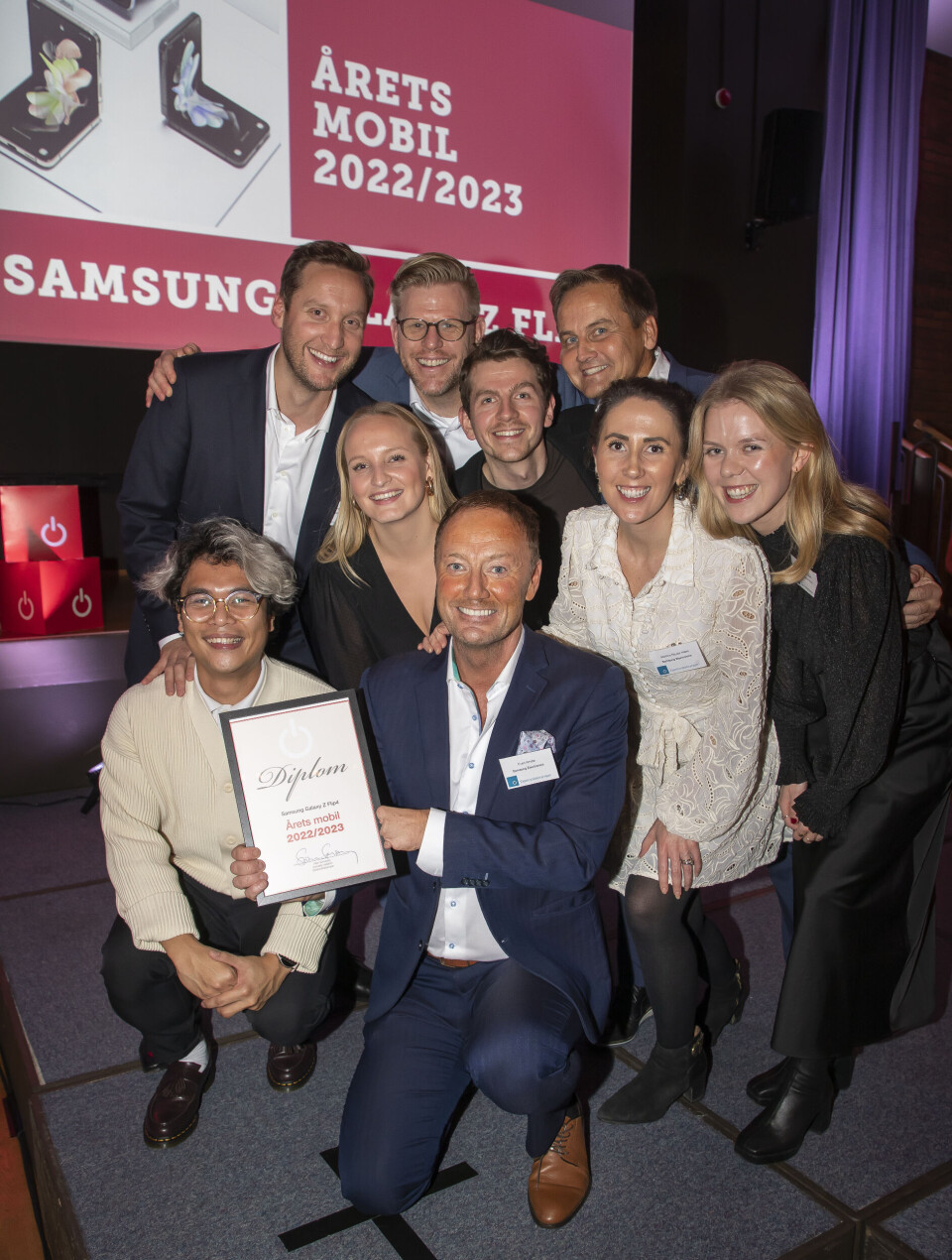 Justin Toribio (f. v.), Anders Lersbryggen, Celina Røste, Anders Walmann, Even Amdal, Petter Worum Daling, Øyvind Aasen, Martina Næss og Henriette Hedenstad i Samsung tok mot prisen for «Årets mobil 2022/2023». Foto: Tore Skaar