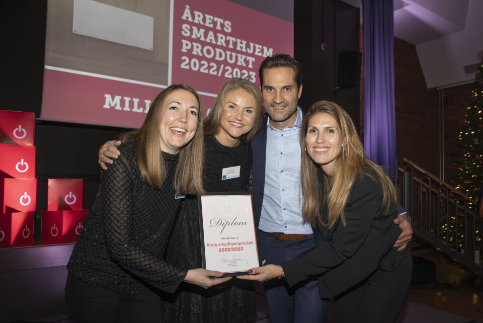 Ane Bryn-Haugland (t. v.), Elise Reiten, Per Robertson og Cecilie Uggen Stang-Lund i Mill International mottok prisen for «Årets smarthjemprodukt 2022/2023». Foto: Tore Skaar