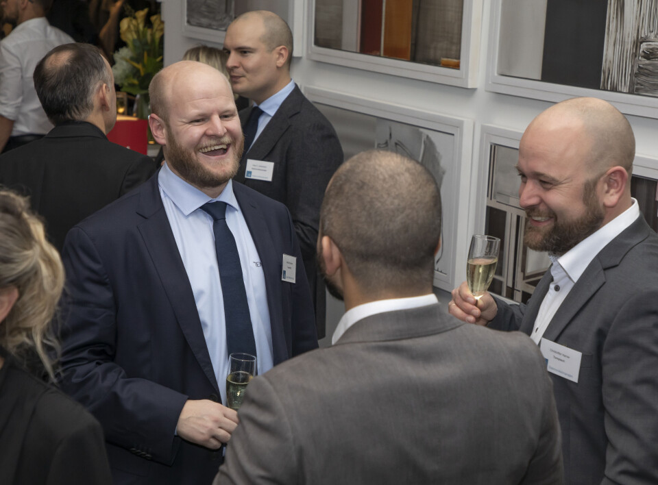 Morten Kleivane (t. v.) og Armand Gustavson (begge Temptech). I bakgrunnen Hans F. Johannesson (Elektronikkbransjen). Foto: Tore Skaar