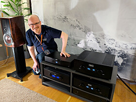 Andreas Bjørnstad med en hånd på den splitter nye D/A-konverteren Hegel D50. Foto: Stian Sønsteng
