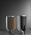 Høyttalere med skulpturelt design med høyttalersylinder i aluminium og trelameller i front.