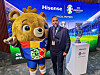 I dag ble det offentliggjort at Hisense er offisiell partner for fotball-EM i Tyskland i 2024. På bildet EM-maskoten (t. v.) og nordisk salgsdirektør for TV, Daniel Eriksson. Foto: Stian Sønsteng