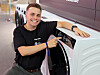 Dennis Pedersen i Gorenje Group Nordic med vaskemaskinen Hisense 7S, med 12 kg kapasitet, berøringsskjerm og KI-programmer. Foto: Stian Sønsteng