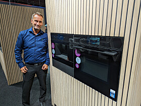 Martin Jensen i Elkjøp med kaffemaskin og stekeovn i Bosch Accent Line-serien. Foto: Stian Sønsteng