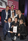 Even Amdal (f. v), Øyvind Aasen, Anders Lersbryggen, Martina Næss, Petter Worum Daling, Anders Walmann, Celina Røste og Henriette Hedenstad i Samsung mottok prisen for «Årets dataprodukt 2022/2023». Foto: Tore Skaar