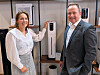 Markedssjef Sophie Lindvik og direktør for forbrukerelektronikk Roger Wollan i Modino med den ultrasoniske luftfukteren Levoit OasisMist 1000S. Foto: Stian Sønsteng