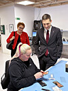 Klima- og miljøminister Andreas Bjelland Eriksen (t. v.) i samtale med konsernsjef Kenneth Gundersen i Elcare. Foto: Elkjøp