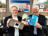 Tom Vedvik (t. v.) med Pinell Supersound 501 og Ole Morten Skymoen med mobiltilbehør fra Cellularline. Foto: Stian Sønsteng