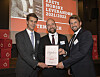 Carsten Andreas Foyn Bruun (f. v.), Armand Munther Gustavson og Christoffer Hamer på scenen da Temptech i 2021 ble kåret til årets norske leverandør. Foto: Tore Skaar