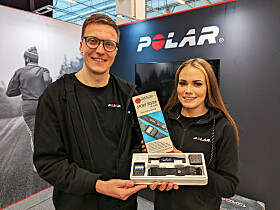Lasse Nielsen (t. v.) og Melina Toven i Polar med Polar Sport Tester PE2000, som da den kom ut i 1982 var den første trådløse pulsmonitoren. Foto: Stian Sønsteng
