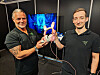Jonas Jacobsen (t. v.) og Christian Hunger i Razer med spillhodesettet Kraken Kitty V2 Pro. Foto: Stian Sønsteng