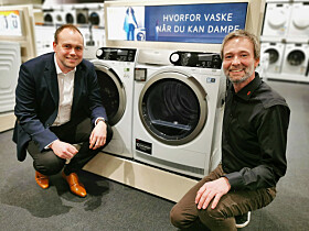 Produktsjef for hvitevarer i Power, Kim Even Vågenes (t. v.), og nøkkelkundesjef Bernt Risøy i Electrolux med vask og tørk i AEGs 8000-serie. Foto: Stian Sønsteng