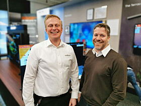 Thomas Marthinsen (t. v.) er norsk salgssjef for lyd og bilde i Power, her sammen med senior salgssjef Paal Anders Jansen i Samsung Electronics Nordic. Foto: Stian Sønsteng