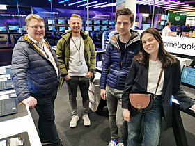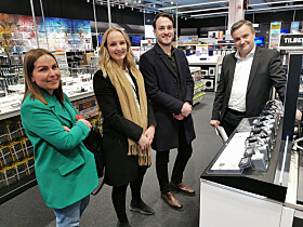 Sandra Torsvik (f. v.), Celina Røste og Andreas Lind i Samsung sammen med kategorisjef Thomas Tønsberg i Power. Foto: Stian Sønsteng