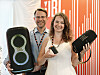Henrik Sie (t. v.) og Cristina Cecilia Mostert med JBL PartyBox Club 120 og Xtreme 4, som bruker det samme utskiftbare batteriet. Foto: Stian Sønsteng