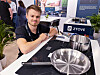 Thomas Lund Mortensen i Ztove med deres dansk utviklede platetopp der temperaturen justeres i grader. En sensor i pannen kommuniserer med en enhet i håndtaket, som igjen kommuniserer med platetoppen. Den slår seg automatisk av, og startes igjen ved å løfte håndtaket en liten centimeter. Dette gjør at batteritiden er to år. Platetoppen kommer også i en utgave med avtrekksvifte, og styres med en berøringsskjerm eller en app. Oppdatering via wifi. Foto: Stian Sønsteng