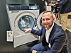 Alexander Wannoff med Mieles nye vaskemaskin W2, som er den første som er produsert uten skovler i trommel. Kommer på markedet i mars 2025, og har en pris på 35.000 kroner. Foto: Jan Røsholm
