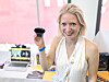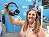 Terra Teat i JLab med de nye hodetelefonene. De er åpne, som gjør at brukeren ikke blir så fort sliten, og samtidig kan høre hva som skjer rundt seg. Foto: Jan RøsholmSe video