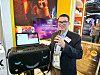 Tero Metsala i Commaxx viser frem fire ulike karokemaskiner. De har høykvalitets høytaler og toppmodellen er utstyrt med vribar skjerm. Foto: Jan RøsholmSe video