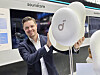 Andreas Ahlgren i Anker med en gigantisk versjon av Soundcore Sleep A30, som skal være verdens første soveørepropper med støyreduksjon. Foto: Stian Sønsteng