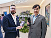 Tommy Holden (norsk representant) og toppsjef Jason Wang for Honor i Norden og Baltikum, med foldetelefonen Magic V3 og Magic7 Pro med Porsche-design. Foto: Stian Sønsteng